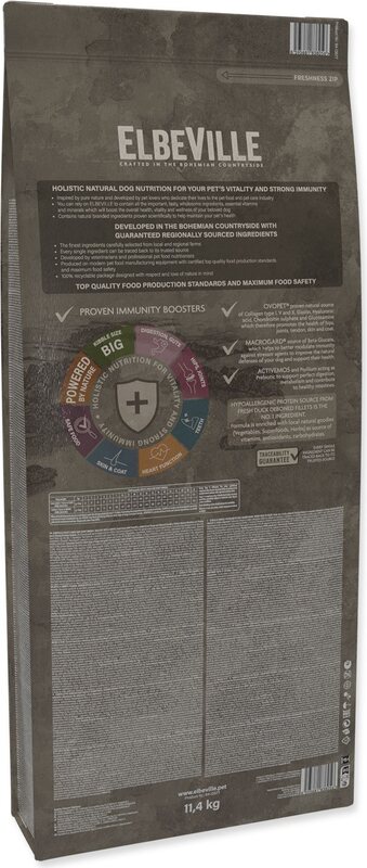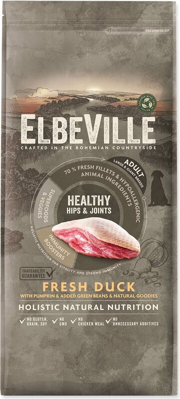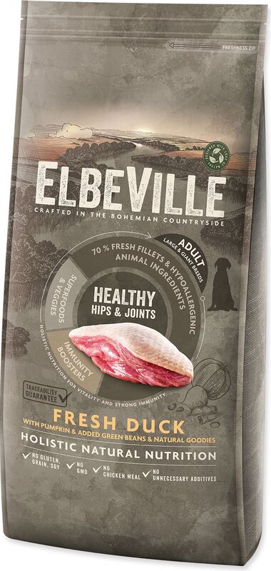 ELBEVILLE е естествена храна за общото здраве на вашето куче. Произведена е от най-добрите природни, местни суровини, включително т.н. супер храни и с високо съдържание на качествено прясно месо. Тази рецептура съдържа 35% прясно обезкостено филе от патица и 27% дехидратирано патица и пуйка.