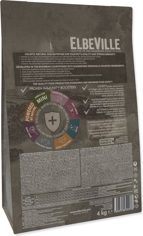 ELBEVILLE е естествена храна за общото здраве на вашето куче. Произведена е от най-добрите природни, местни суровини, включително т.нар. супер храни и с високо съдържание на качествено прясно месо. Тази рецептура съдържа 35% прясно обезкостено филе от патица и 27% дехидратирана патица и пуйка.