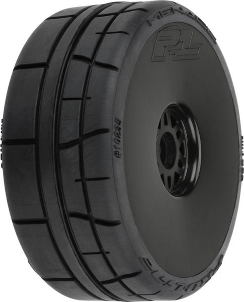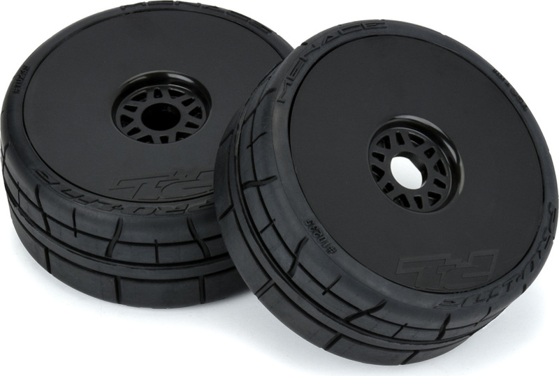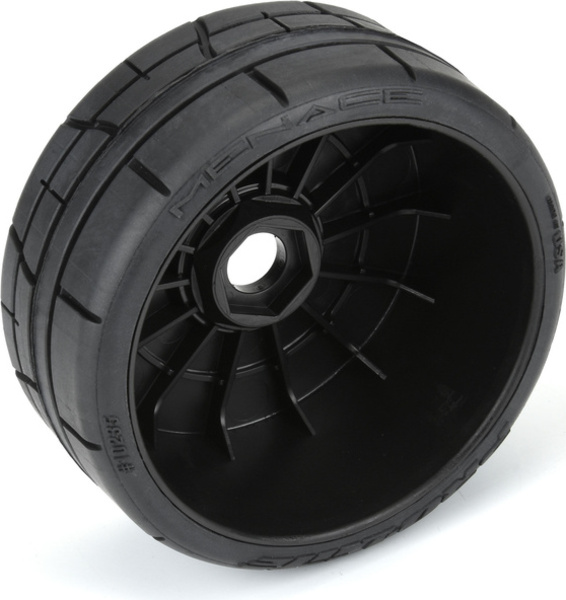 Комплектни колела Pro-Line 1:8 с гуми Menácia HP BELTED Speed Run, дискове Mach 10 черен, шестоъгълник H17 (2 бр. в опаковка). Колелата са предназначени за RC автомобили 1:7 Limitless, Infraction, Felony, Typhon и други, в мащаб 1:7 и 1:8, с шестоъгълници 17mm. Диаметър 99mm, ширина 42mm.