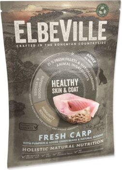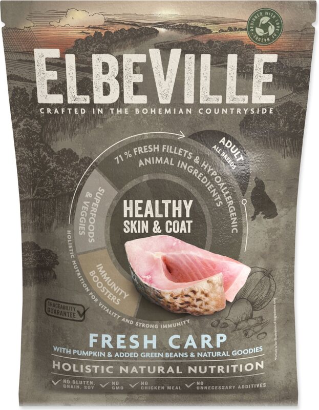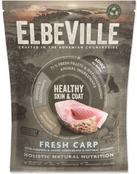 ELBEVILLE е естествена храна за общото здраве на вашето куче. Произведена е от най-добрите натурални, местни съставки, включително т.н. супер храни с високо съдържание на качествено прясно месо. Тази рецептура съдържа 35% прясно обезкостено филе от шаран и 28% дехидратирана патица и индийско пиле.