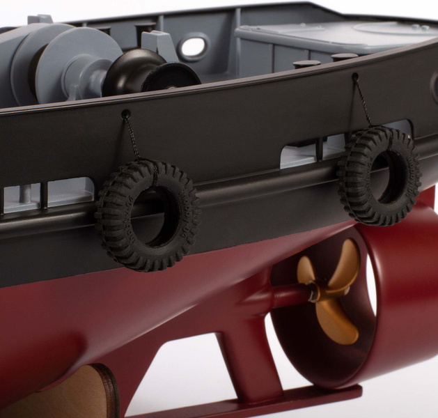 RC моделът на лодката Tug Boat е реализиран реалистично, можете да се насладите на гумени накрайници, задната палуба с лебедка и кран, или стълби на мостика с парапет.