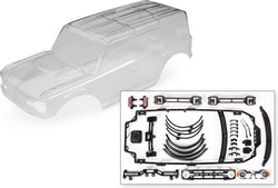 Traxxas каросерия Ford Bronco 2021 прозрачна (изисква боядисване). Включва части от каросерията (предна решетка, странични огледала, дръжки на вратите, калници, чистачки, държач за резервна гума, система за безскобово закрепване). Предназначена за RC модел Traxxas TRX-4 Ford Bronco 2021 или други модели TRX-4 с междуосие 324 мм / конверсионен комплект с инсталирани калници за безскобово закрепване на каросерията.